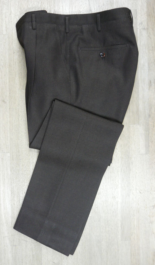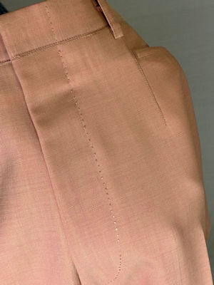 地の目を大切に縫製しアイロンワークによる後ろ身のクセ処理による流れるようなラインを実現 縫製は生地の地の目を大切にして縫製しています。パンツは後ろ身のアイロンワークによる「クセ取り」処理をします。この工程を怠ると履き心地に影響しますので大変重要な工程です。 |